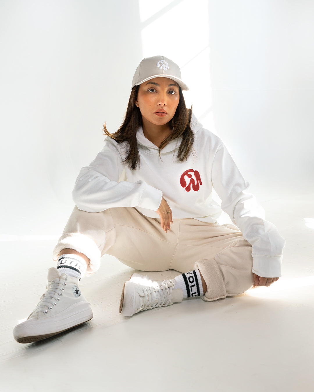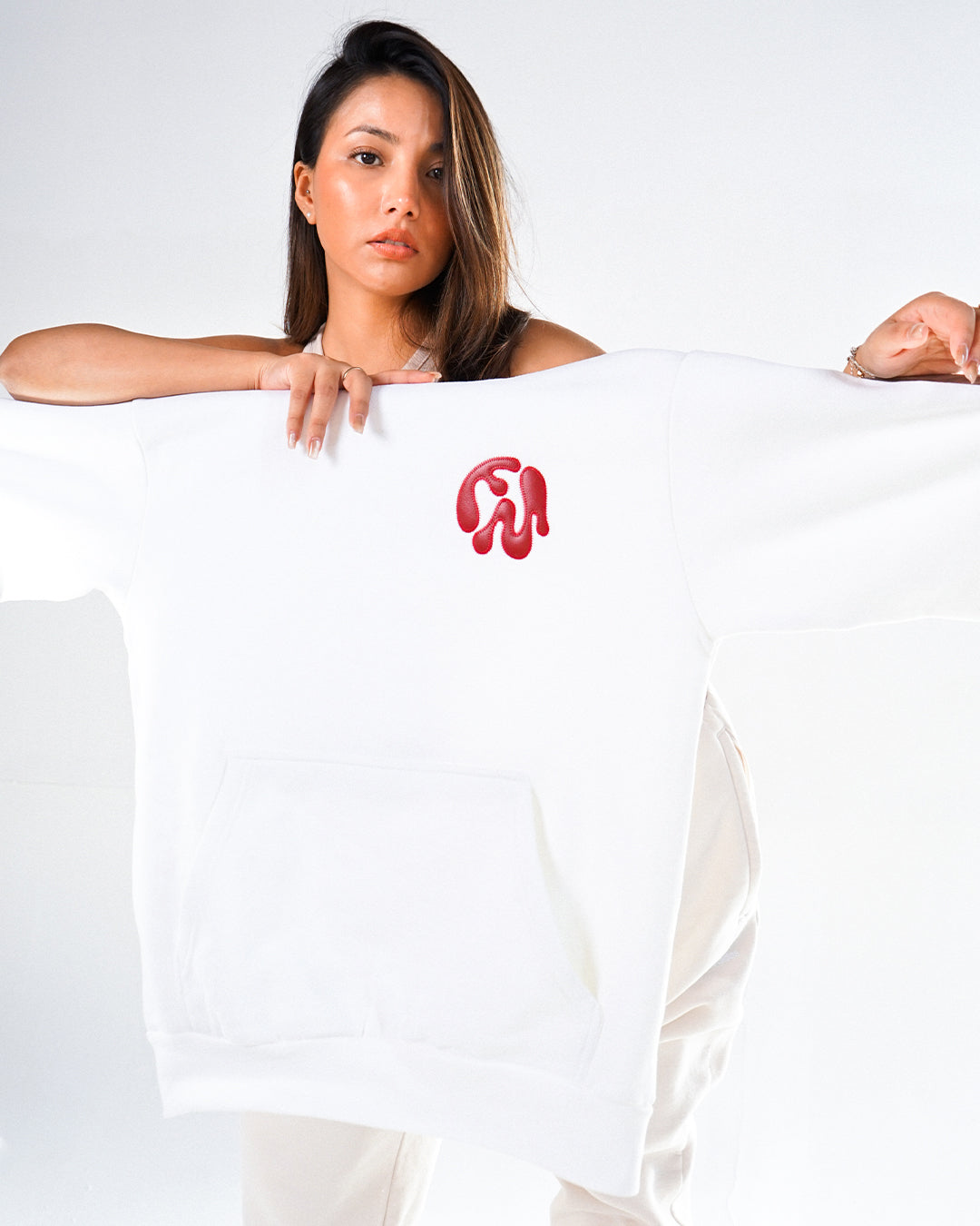 Available in crisp white, the hoodie is finished with our signature brand icon in Vietnam Red on a premium leather detail, adding a subtle touch of character to this one-of-a-kind piece.
